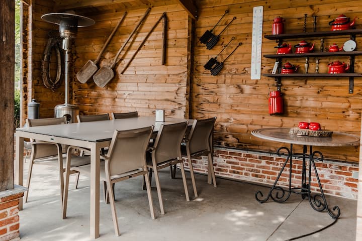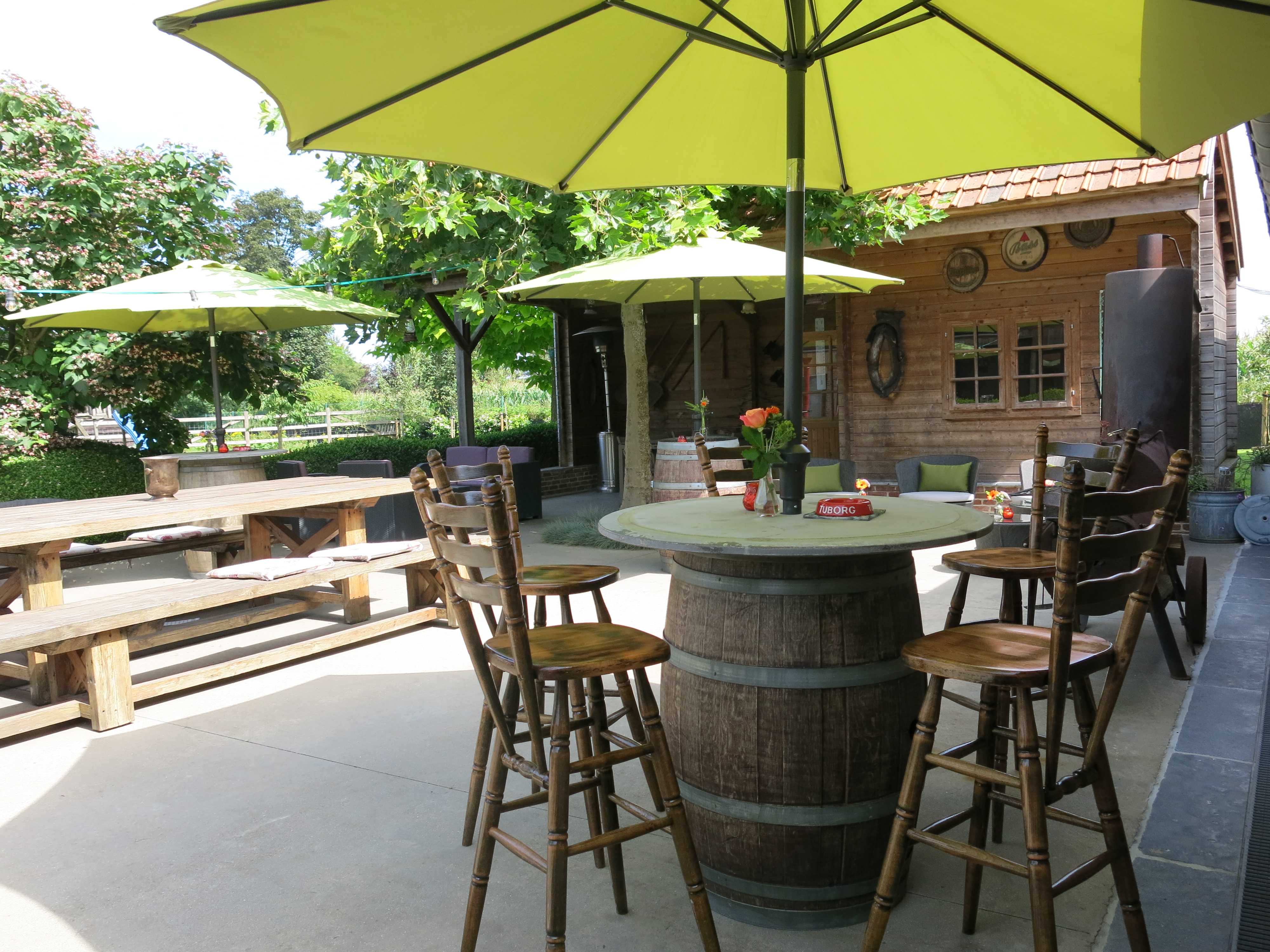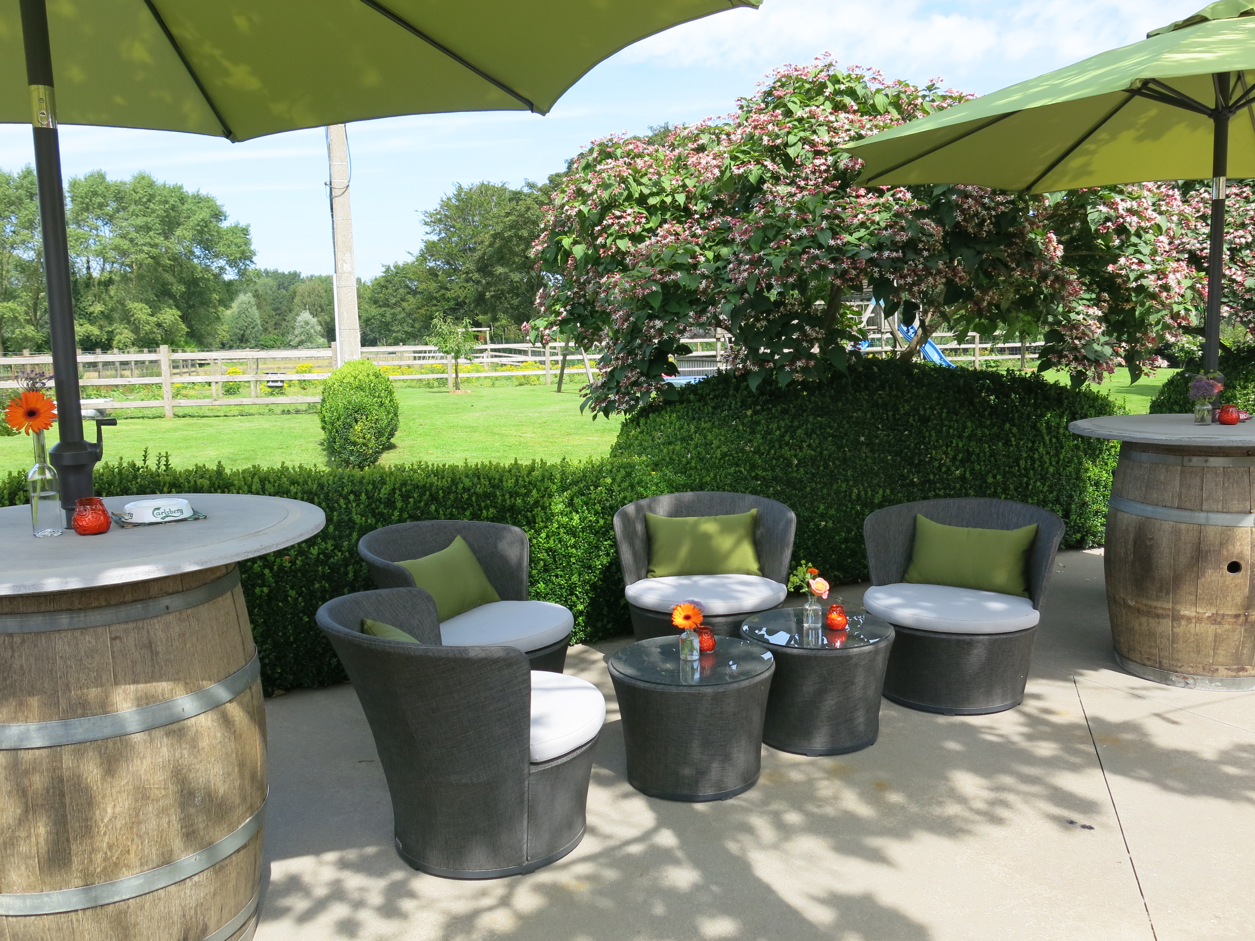 Geniet van ons grote terras met loungezetels, zachte kussens en 6 wijntonnen met parasols,